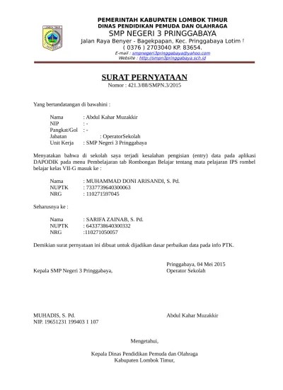 Kop sekolah surat pernyataan nomor : Surat ini akan berjudul/bernama surat pernyataan bersalah. Surat pernyataan dalam bentuk formulir bisa dibilang salah satu bentuk surat pernyataan yang simpel dan mudah, khususnya bagi pembuat pernyataan . Lihat contoh surat berita acara kesalahan input data paling lengkap. Menyatakan bahwa telah melakukan kesalahan perekaman data isian surat setoran pajak atas nama wajib pajak:. Artinya seseorang membuat sebuah surat yang berisi pernyataan kesalahan atau mengakui kesalahan. Demikian surat pernyataan ini dibuat untuk perbaikan data pada info ptk. ¦ yang bertandatangan di bawah ini : Umumnya ini dibuat oleh mereka yang melanggar peraturan. Surat pernyataan pahami jenis dan cara buatnya dengan baik. Misalnya saja kesalahan input data yang tertulis pada kartu bpjs yang berbeda dengan data di ktp. Kumpulan gambar tentang contoh surat pernyataan kesalahan input data, klik untuk melihat koleksi gambar lain di kibrispdr.org. 297 contoh surat kuasa download doc cara membuat.